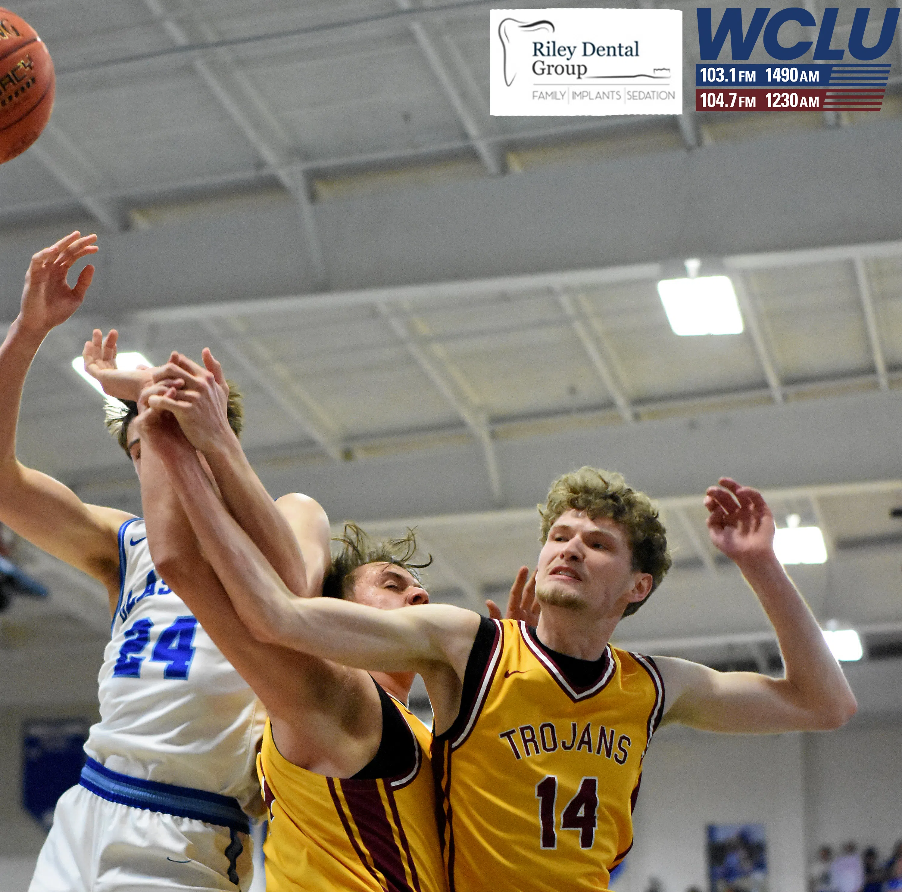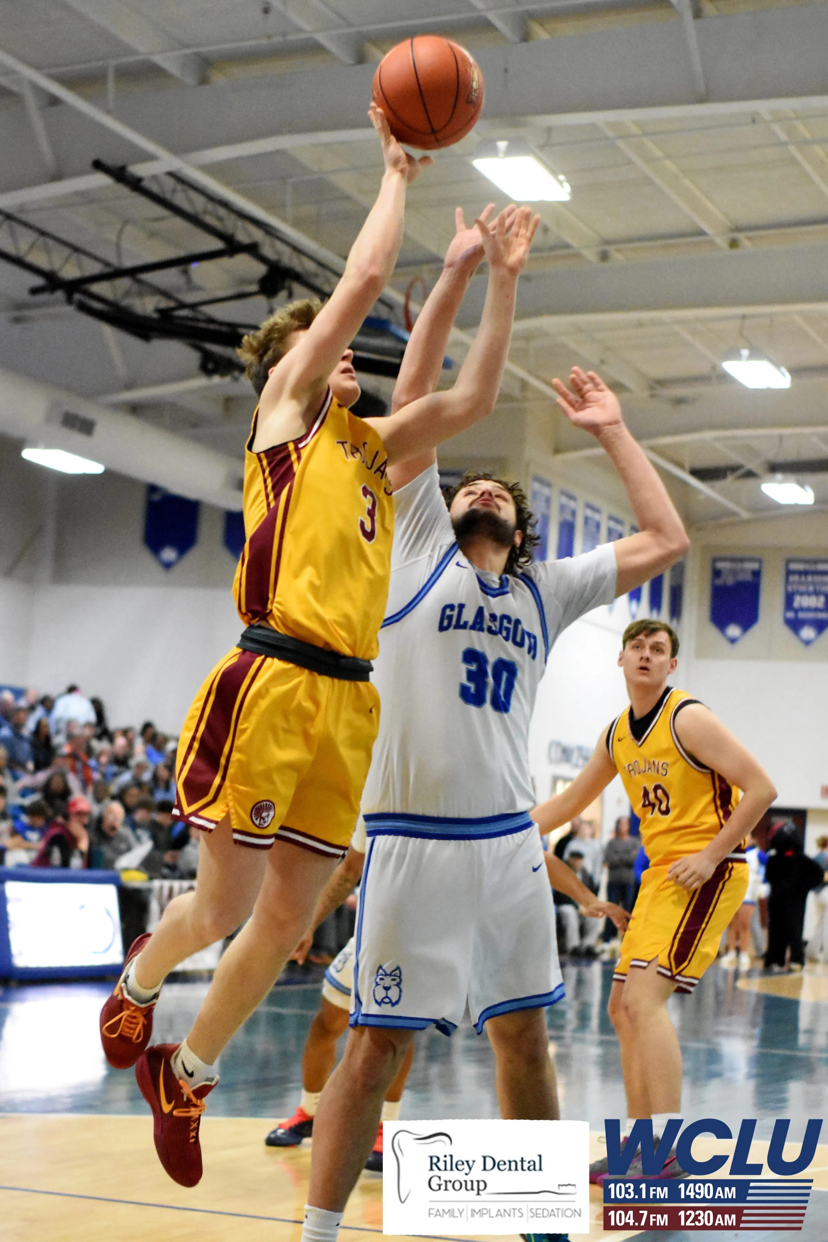 Barren County’s Cameron Pippen and Gavin Nunn, and Glasgow’s Carter Hodges battle for a rebound in the Boys 15th District Tournament championship. The Scotties beat the Trojans, 75-67, in double overtime. James Brown/WCLU Sports