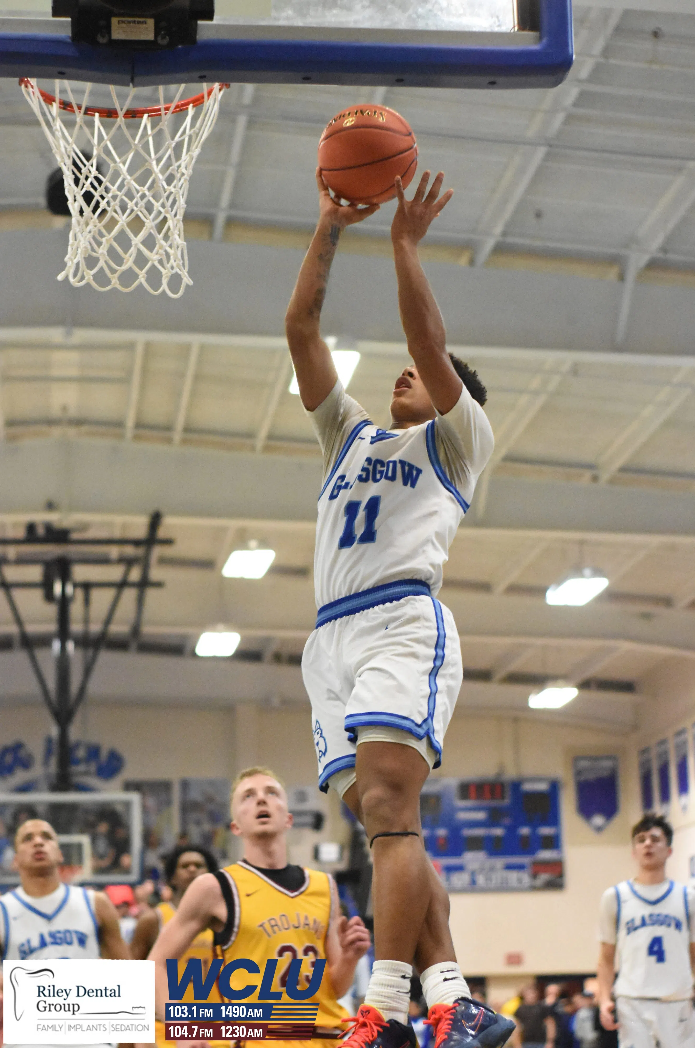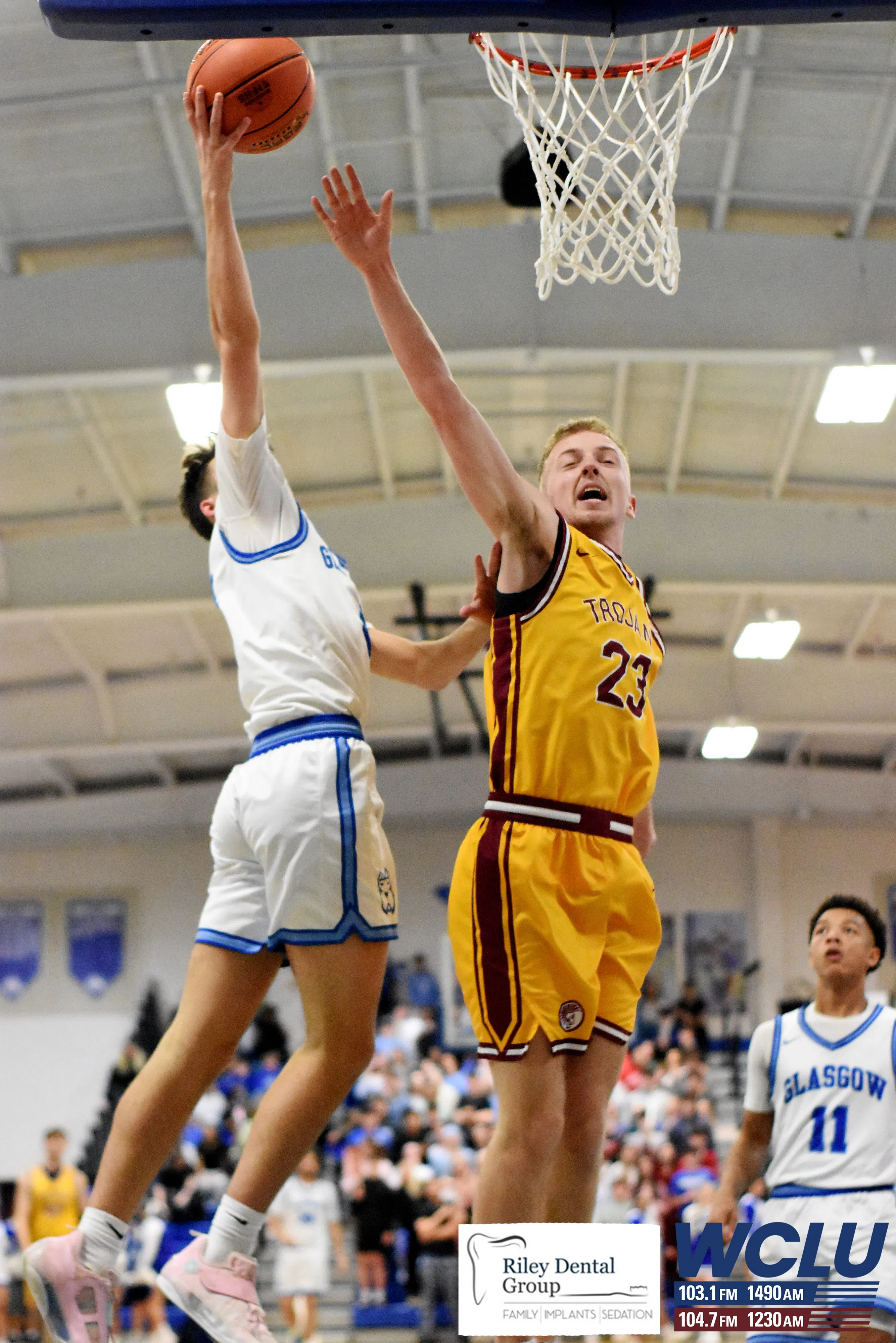 Glasgow’s Jackson Norris shoots a layup as Barren County’s Kade Hardy tries to block the shot in the Boys 15th District Tournament championship. The Scotties beat the Trojans, 75-67, in double overtime. James Brown/WCLU Sports