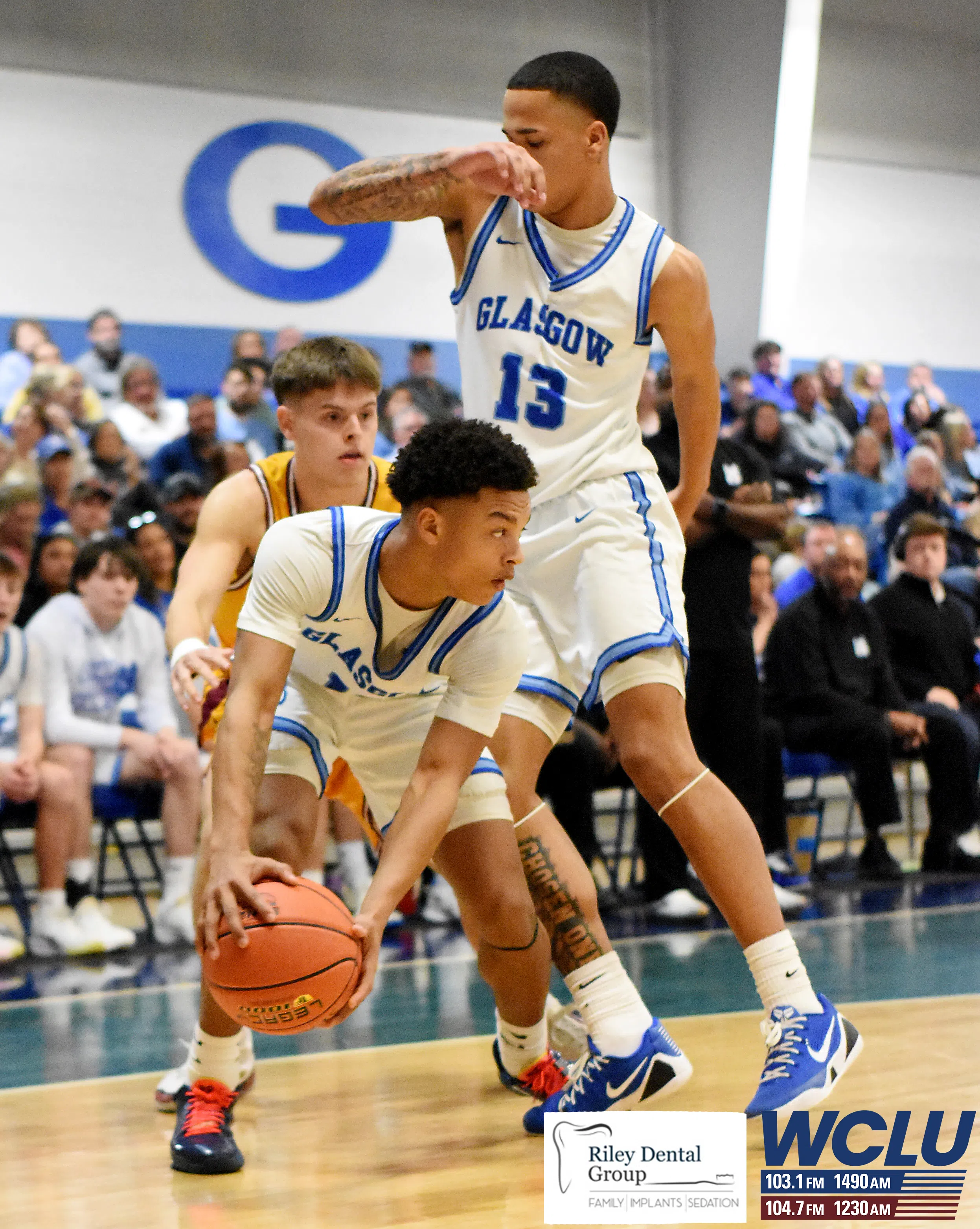 Glasgow’s Jeremiah Moore defends Barren County’s Weston Shelton in the Boys 15th District Tournament championship. The Scotties beat the Trojans, 75-67, in double overtime. James Brown/WCLU Sports