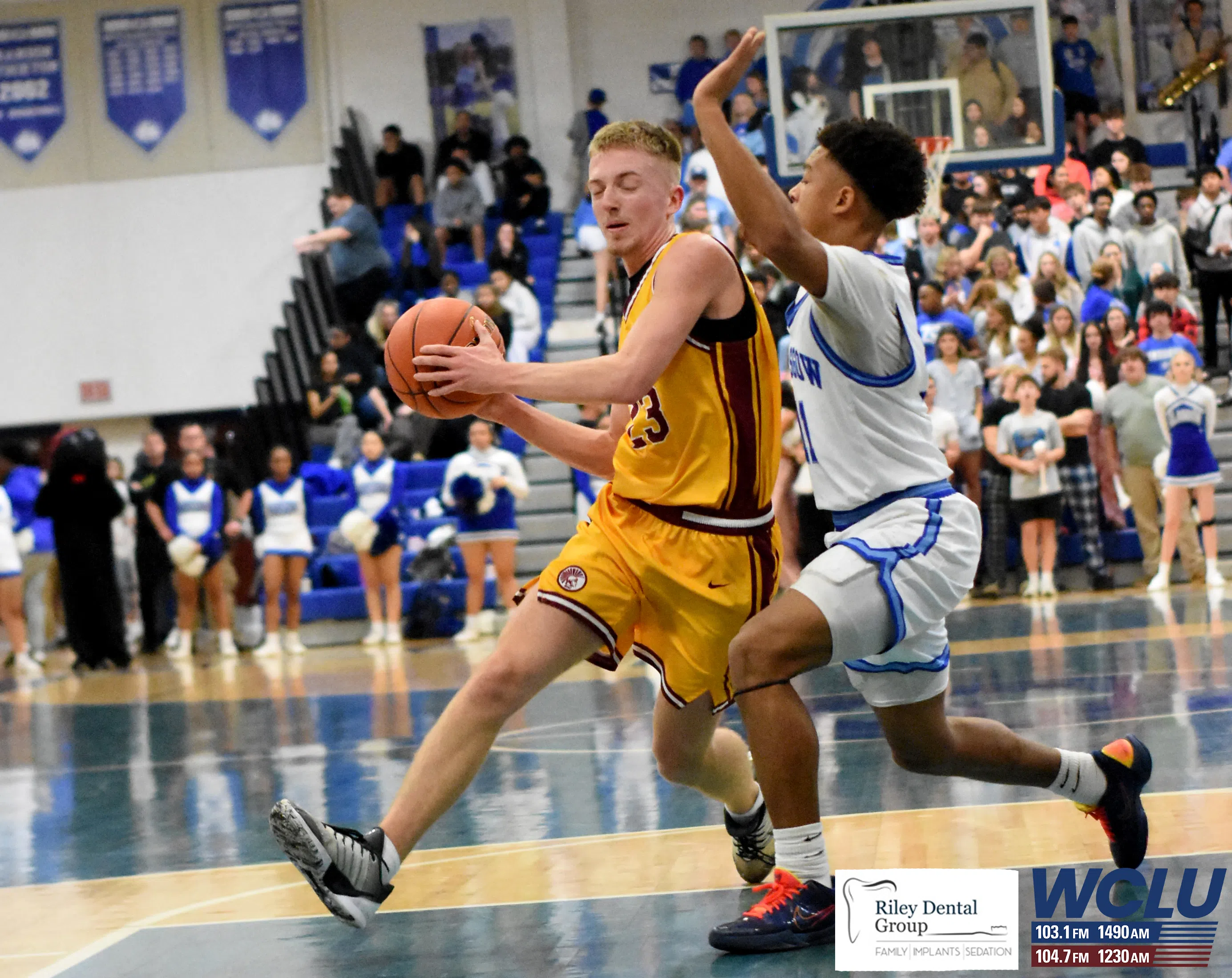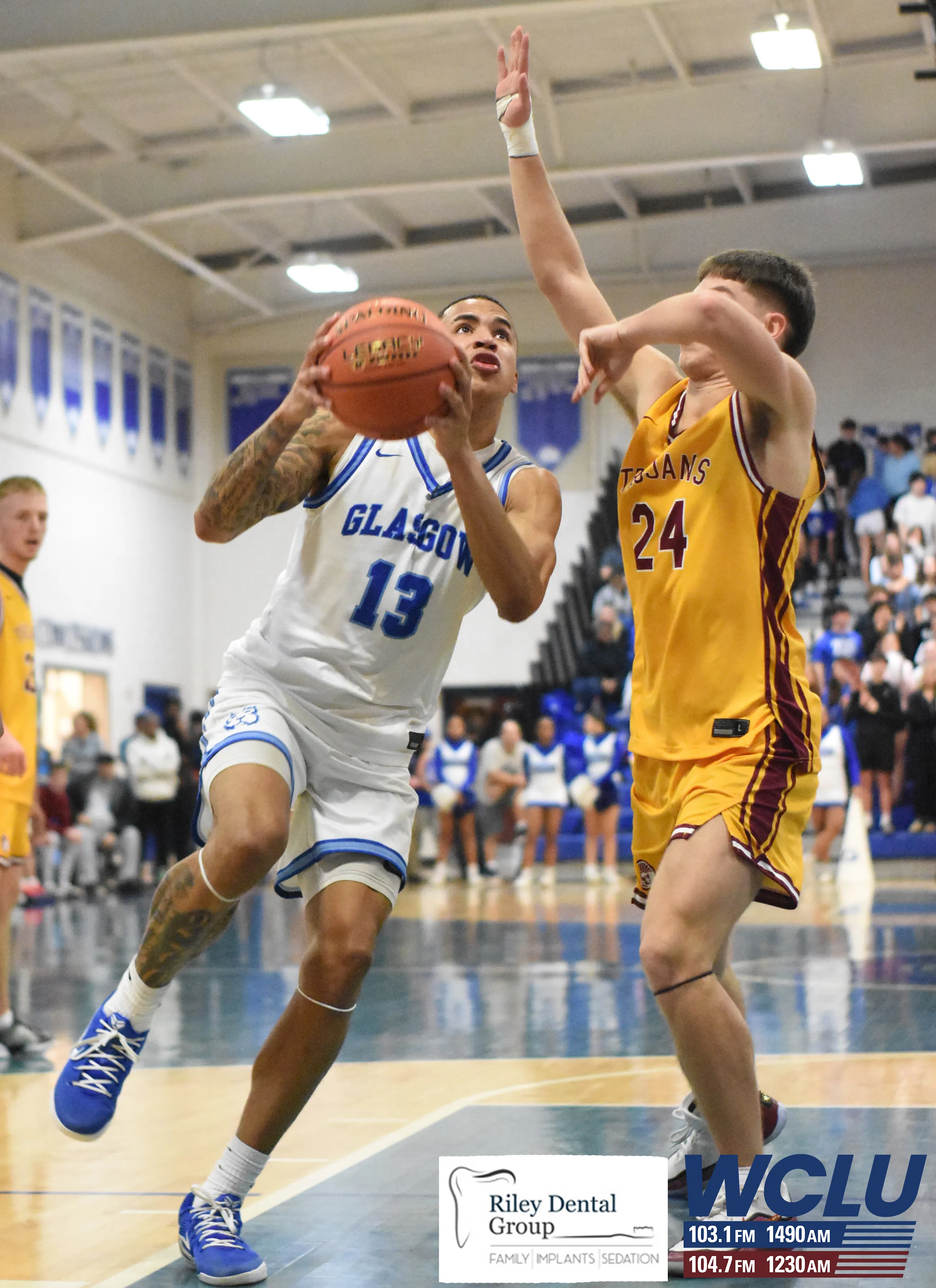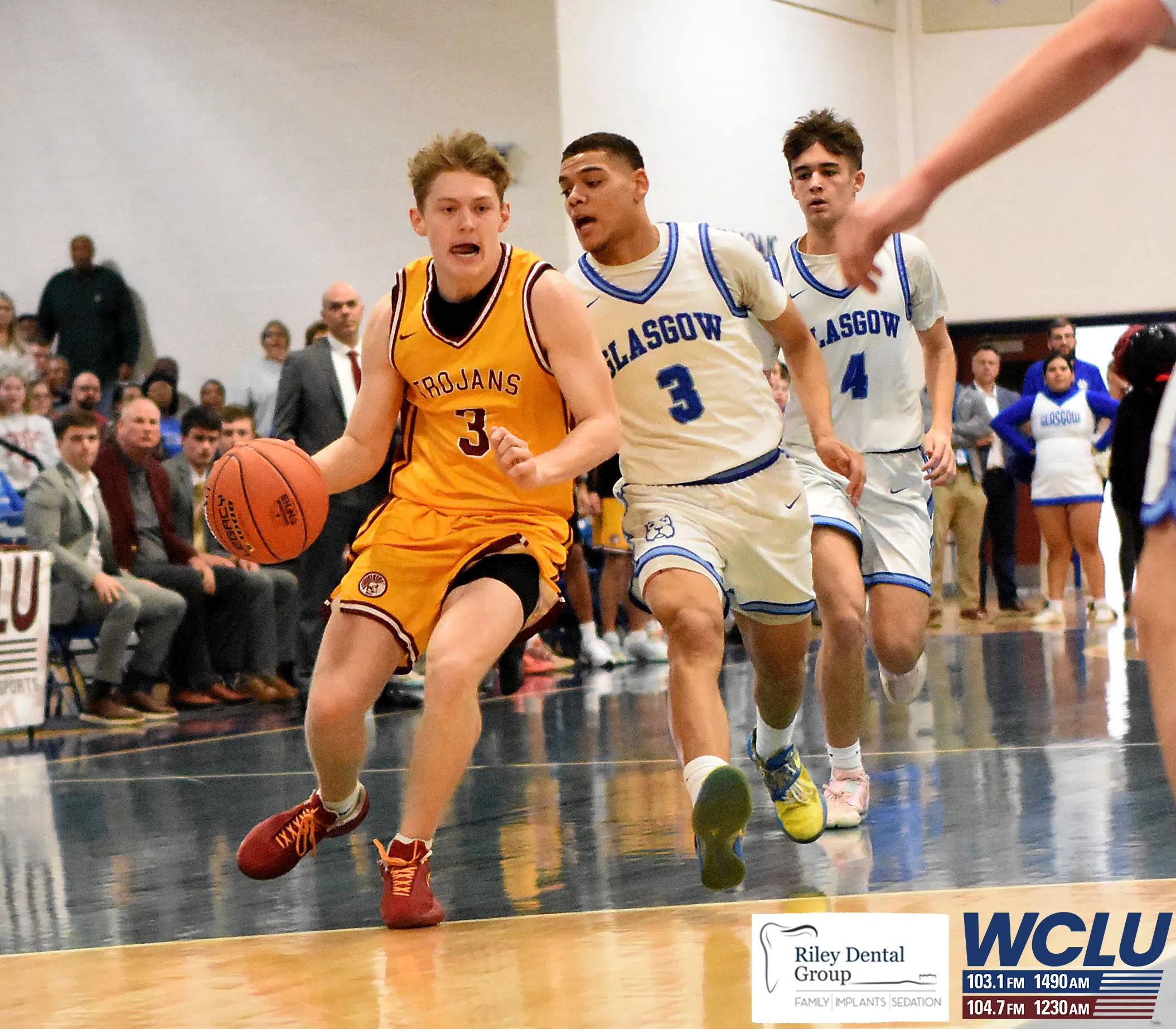 Barren County’s Weston Shelton drives ahead of Glasgow’s Jeremiah Moore in the Boys 15th District Tournament championship. The Scotties beat the Trojans, 75-67, in double overtime. James Brown/WCLU Sports
