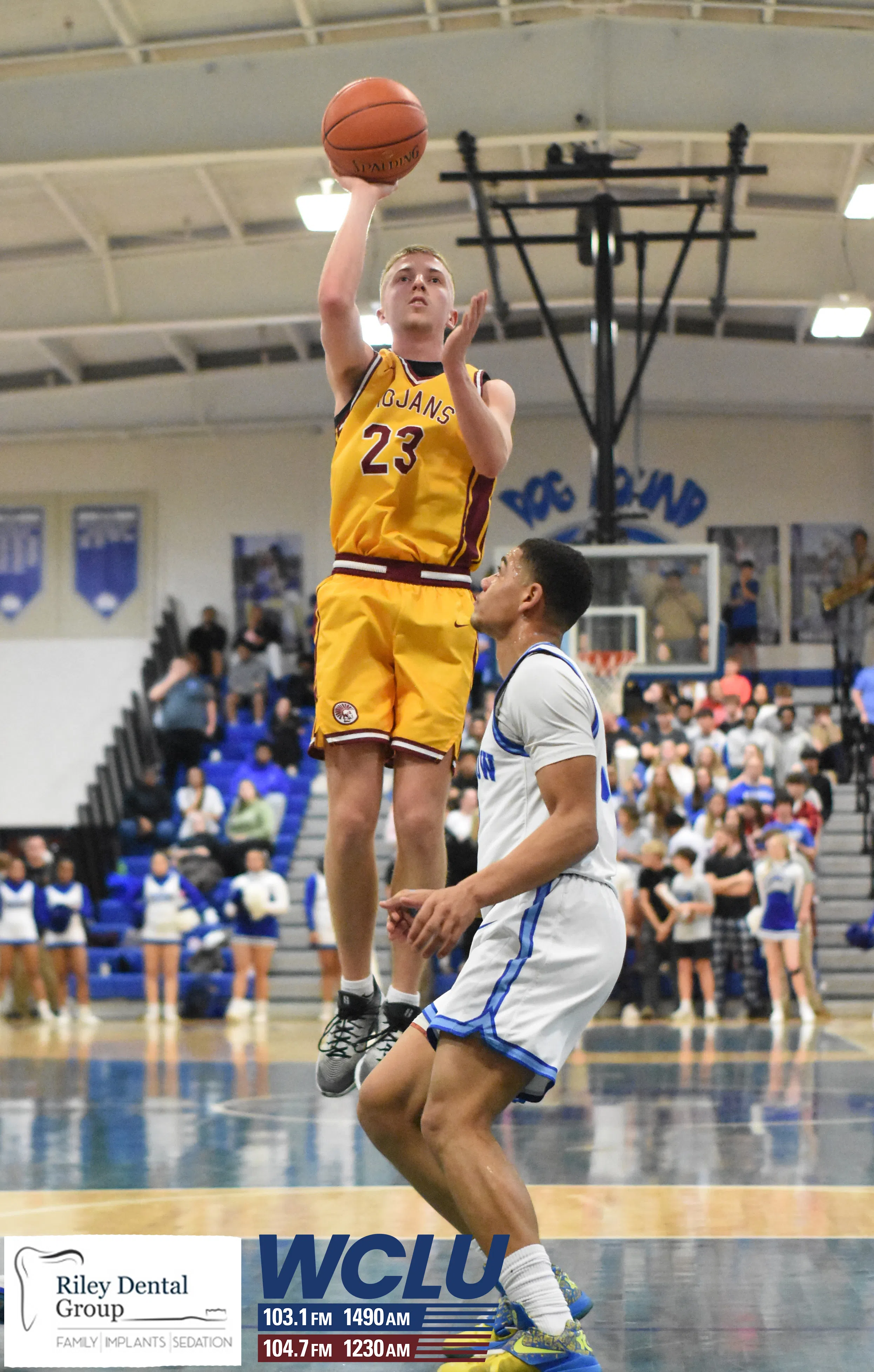 Barren County’s Weston Shelton shoots in front of Glasgow’s Landon Minton in the Boys 15th District Tournament championship. The Scotties beat the Trojans, 75-67, in double overtime. James Brown/WCLU Sports