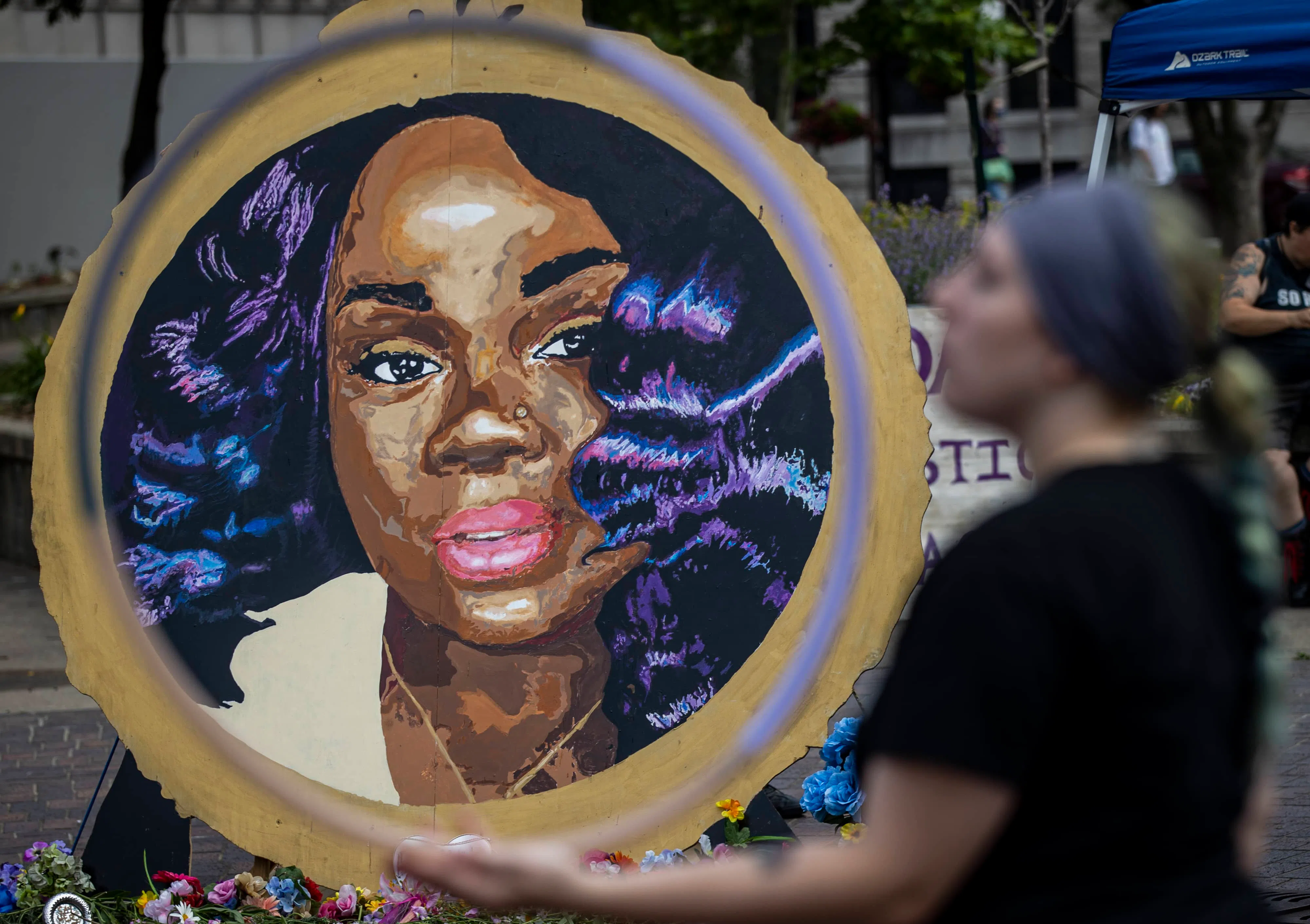 A portrait of Breonna Taylor is framed by the motions of a hula-hooper at Jefferson Square after it was transformed back to 'Injustice Square' as people arrived to celebrate Breonna Taylor on the one-...