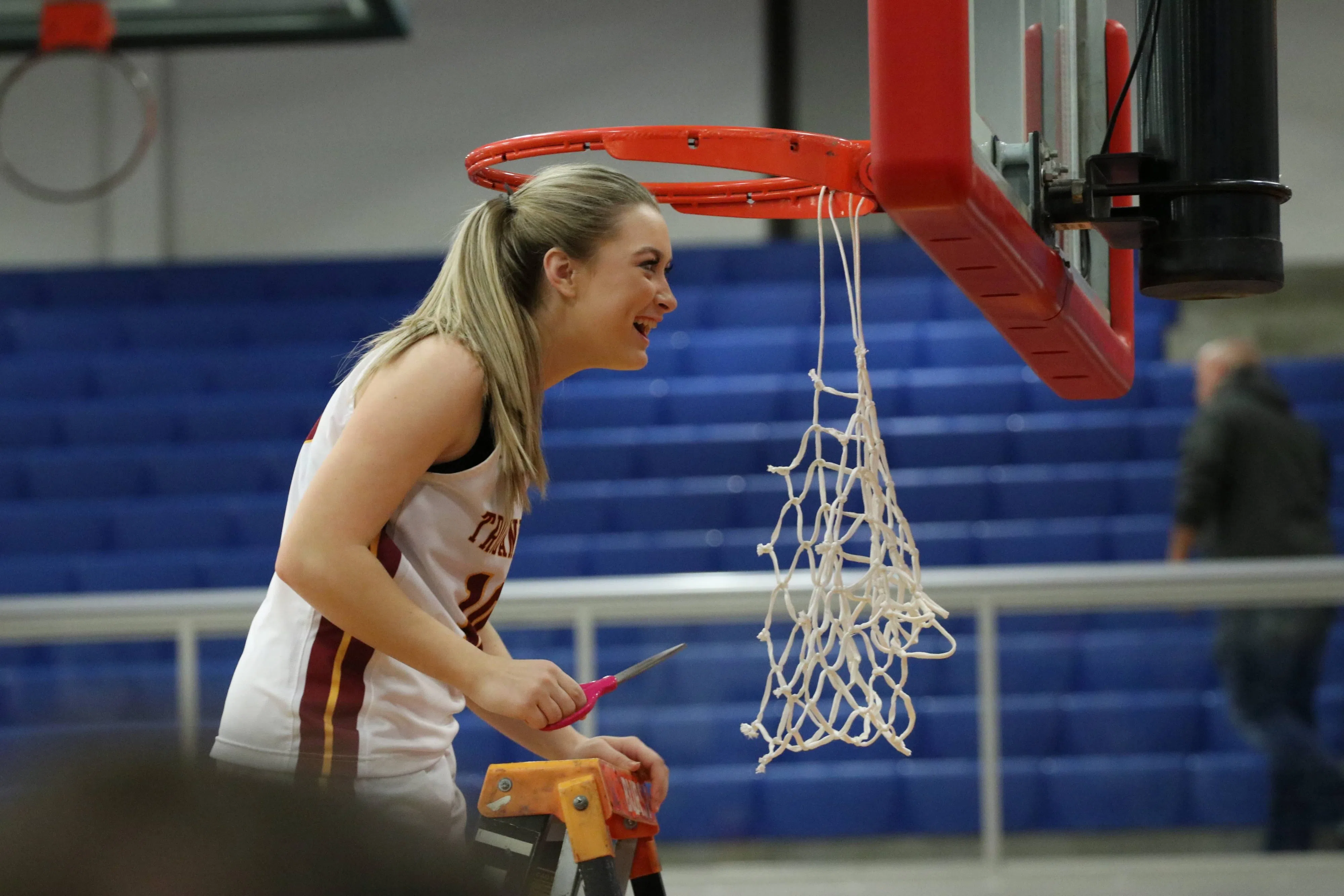 Gracelyn Deweese, a player for the Barren County Trojanettes, cuts a net at Allen County-Scottsville High School after the team won the 15th District Championship on Thursday, Feb. 27, 2020. (BRENNAN ...