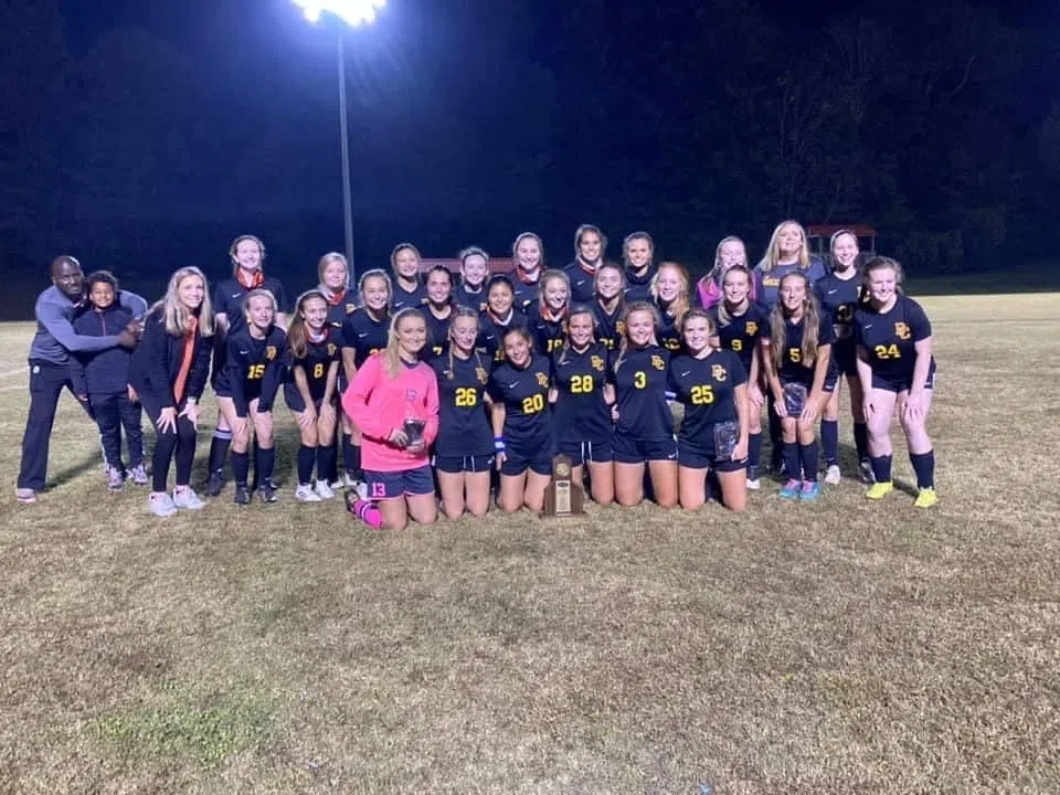 Members of the Barren County Trojanette soccer team gather around the 15th District Title after a double overtime game against the Glasgow Lady Scotties on Tuesday, Oct. 13, 2020. PHOTO: Barren County...