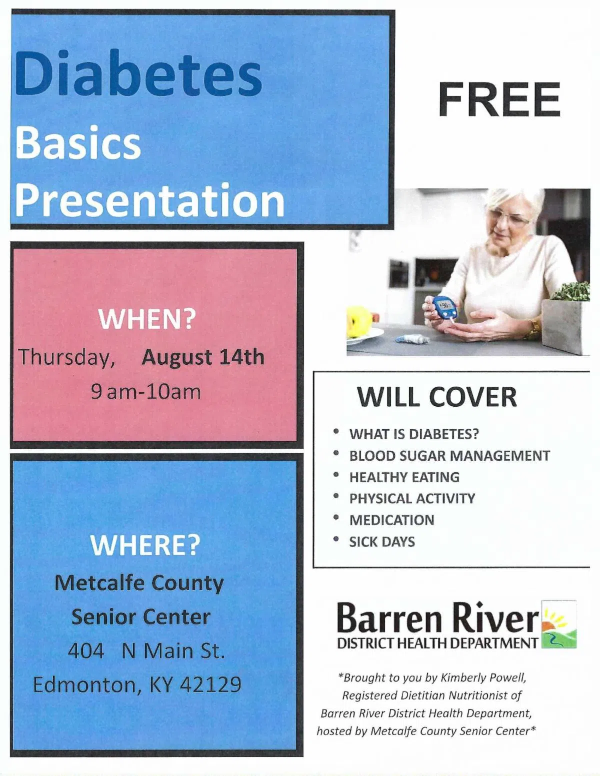 Barren River District Health Department will present a free Diabetes Basics Presentation on August 14 at the Metcalfe County Senior Center from 9 to 10AM.