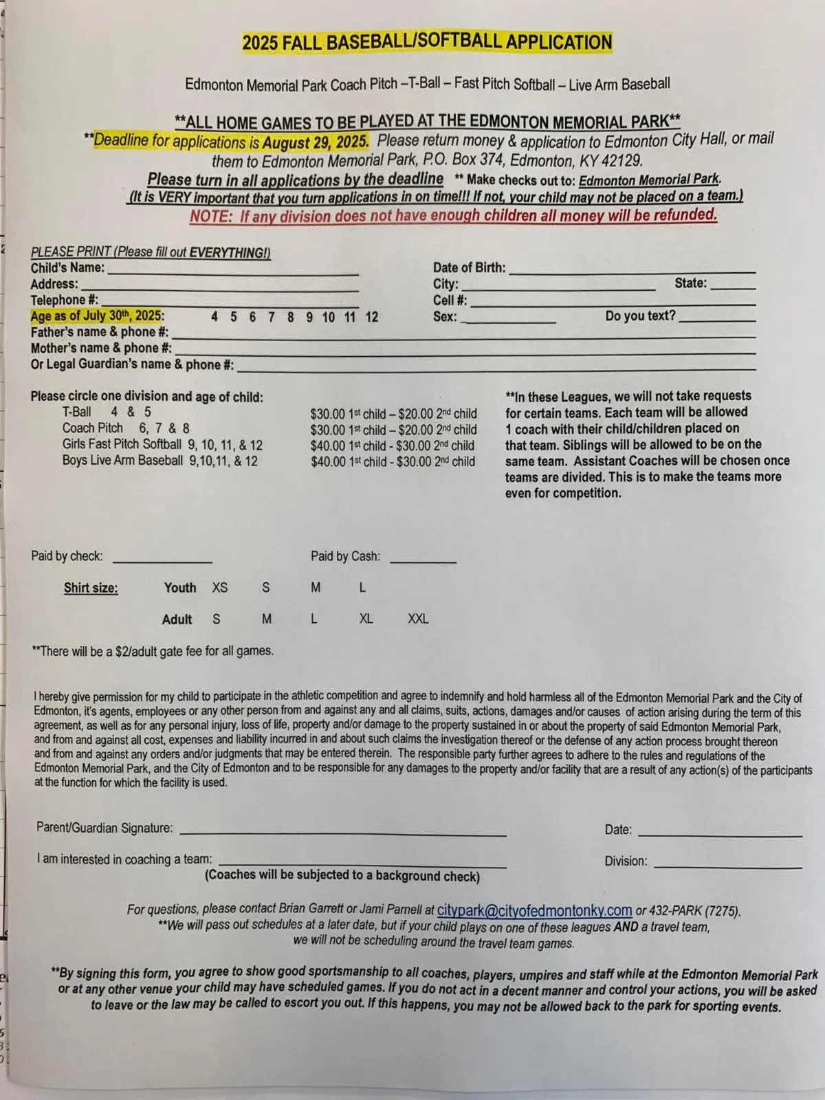 Applications are for coach pitch, t-ball, fast pitch softball and live arm baseball.