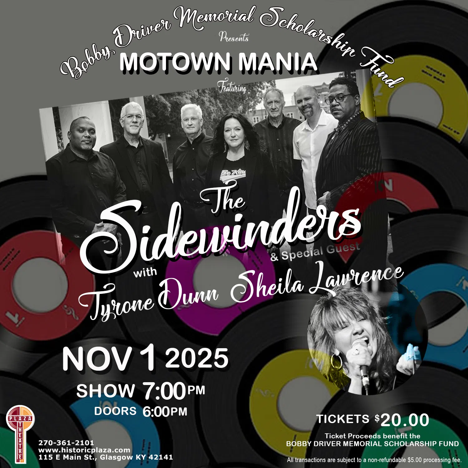 The Bobby Driver Memorial Scholarship Fund presents "Motown Mania" featuring Sidewinders and Tyrone Dunn and Shelia Lawrence at 7PM on November 1 at the Plaza Theatre. Doors will open at 6PM. Proceeds benefit the Bobby Driver Memorial Scholarship Fund.