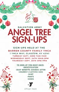 Signups for the Salvation Army Angel Tree will be held at the Barren County Family YMCA on Tuesday, September 23 from 7 to 11AM, Wednesday, September 24 from 10AM to 2PM and Thursday, September 25 from 3 to 7PM. Applicants must have identification, snap benefits awards letter, children's sizes for shirts, pants and shoes.