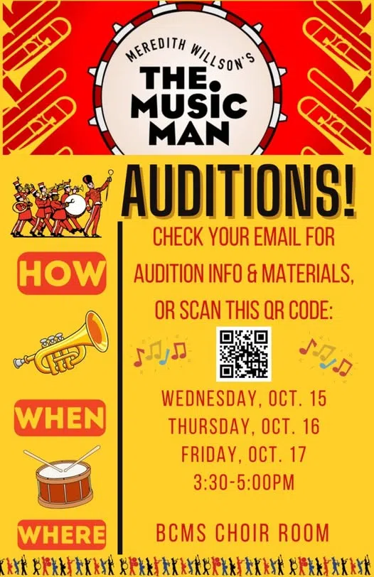 Auditions for "The Music Man" will be held in the B C M S Choir Room