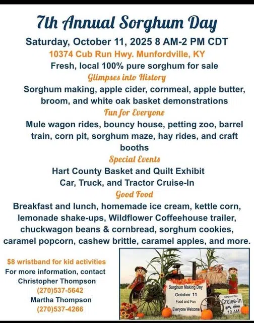 The 7th annual Sorghum Day will be held on Saturday, October 11 from 8AM to 2PM at 10374 Cub Run Highway in Munfordville. Activities include sorghum making, apple cider, cornmeal, apple butter, broom and white oak basket demonstrations. Also mule wagon rides, bouncy house, petting zoo, barrel train, corn pit, sorghum maze, hay rides and craft booths and much more.