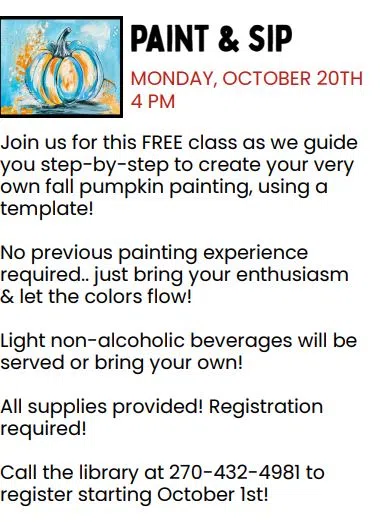 A Paint and Sip Class will be held at the Metcalfe County Public Library beginning at 4PM on Monday, October 20. This is a free class, no previous experience required. Non alcoholic beverages will be served. All supplies provided but registration is required. Call the library 432-4981.