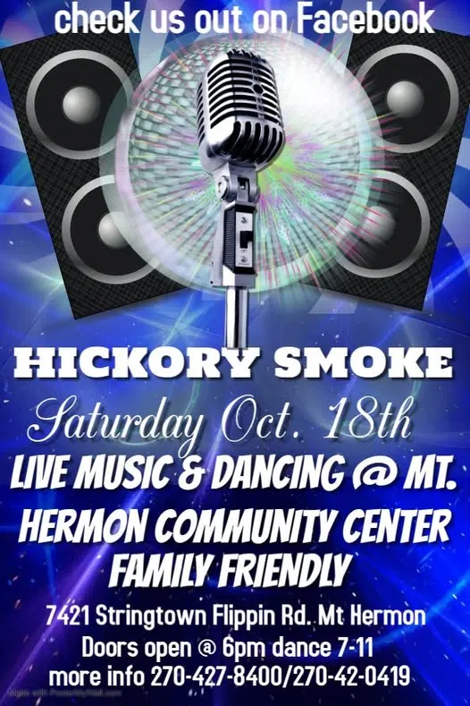 A family friendly non- profit dance will be held at the Mt Hermon Community Center on Saturday, October 18 featuring Hickory Smoke. Doors open at 6:00PM and the dance is from 7:00pm-11:00pm. For more information call, 270-427-8400