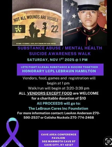 The Substance Abuse/ Mental Health Suicide Awareness Walk/Run will be held this Saturday, November 1 at the Cave Area Conference Pavilion. Vendors, food, games and registration begins at 1PM. Proceeds will go to the Lebrum Cares Inc Foundation. For more information call Lee Ann Anderson at 590-2537.